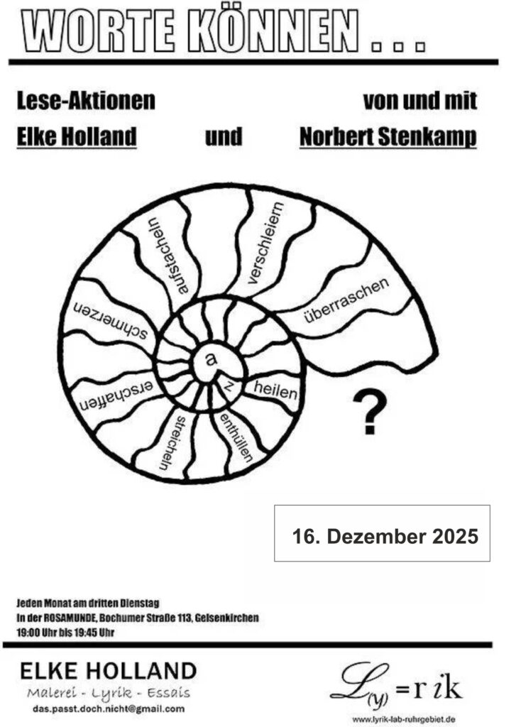 Worte können bewegen, überraschen, berühren – und genau das werden sie tun, wenn Elke Holland und Norbert Stenkamp am 16. November 2025 zu ihrer literarischen Veranstaltung WORTE KÖNNEN… einladen.