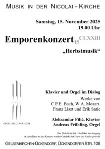 Am Samstag, den 15. November 2025, findet in der Nicolai-Kirche Gelsenkirchen-Ückendorf ein besonderes Musikereignis statt: das 173. Emporenkonzert mit dem Titel „Herbstmusik“.