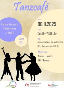 Am 8. November 2025 lädt das Gemeindehaus der Nicolai-Kirche (Flöz Sonnenschein 60, Gelsenkirchen) von 15:00 bis 17:00 Uhr zum Tanzcafé ein.