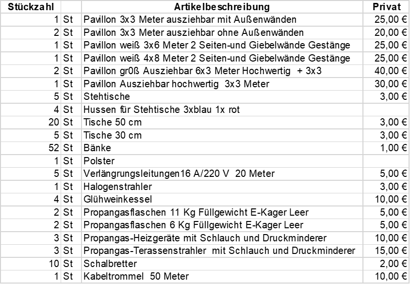 Für die Ausrichtung von Feiern können auf Anfrage verschiedene Materialien und Ausstattungen ausgeliehen werden. Dazu gehören:
