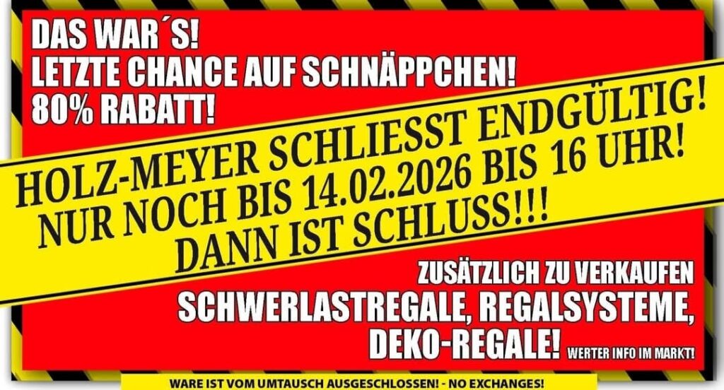 Nach vielen erfolgreichen Jahrzehnten geht bei Holz-Meyer eine Ära zu Ende. Das traditionsreiche Unternehmen befindet sich derzeit in der Schließung und bietet im Rahmen eines großen Räumungsverkaufs noch einmal attraktive Sonderangebote mit Preisnachlässen von bis zu 80 % an.