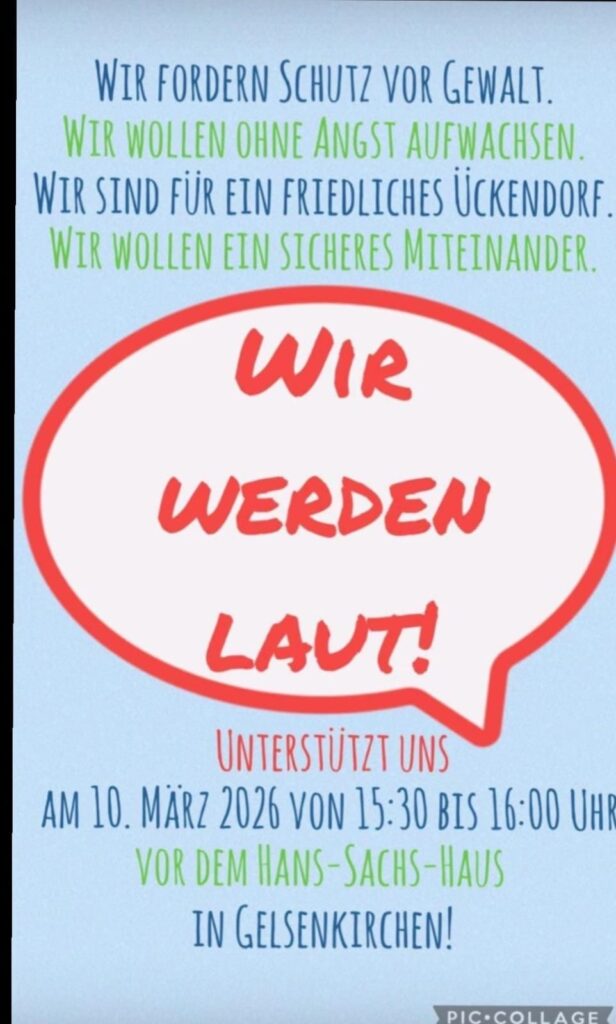 Ein starkes Zeichen gegen Gewalt und Angst: Mit klaren Worten und mutigen Stimmen wollen Kinder und Unterstützer in Ückendorf auf ein wichtiges Thema aufmerksam machen. Unter dem Motto „Wir werden laut!“ rufen sie zu einer gemeinsamen Aktion auf, um für mehr Schutz, Sicherheit und ein friedliches Miteinander einzustehen.