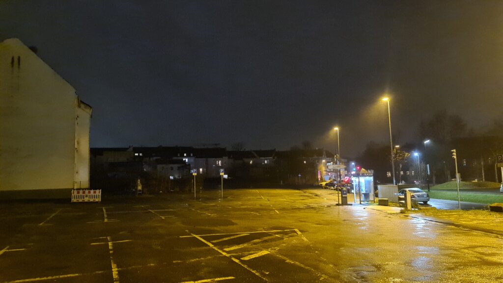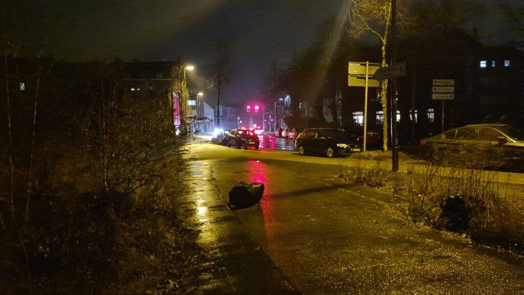 Des Weiteren ist der südliche Teil des Parkplatzes gänzlich unbeleuchtet. Es sind auch keine Laternen vorhanden.