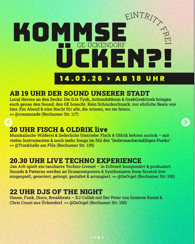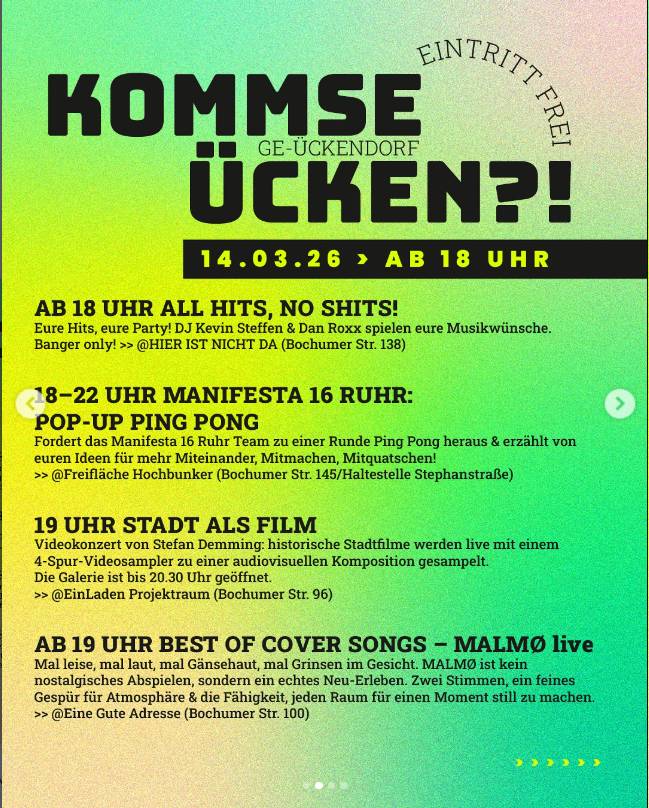 Was einst als kleiner kultureller Impuls begann, ist längst zu einem festen Bestandteil des Stadtlebens geworden. Kommse Ücken?! steht für Nachbarschaft, Kreativität und Zusammenhalt – Werte, die Ückendorf in besonderer Weise prägen.