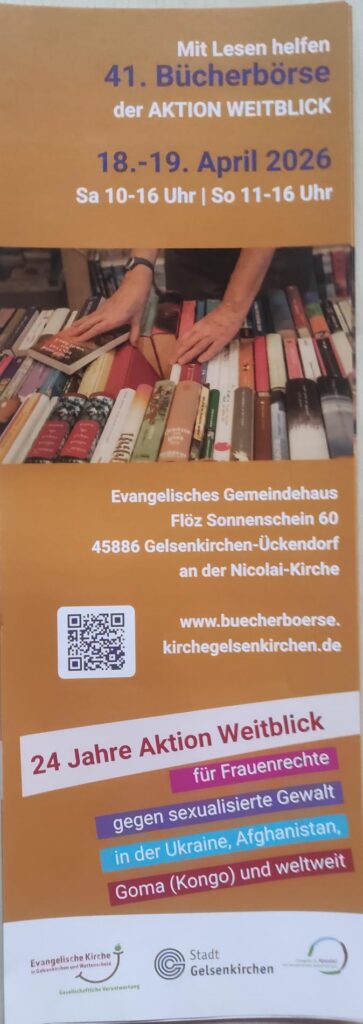 Am 18. und 19. April 2026 findet in Gelsenkirchen die 41. Bücherbörse der Aktion Weitblick statt. Veranstaltungsort ist das Evangelische Gemeindehaus an der Nicolai-Kirche im Stadtteil Ückendorf (Flöz Sonnenschein 60).