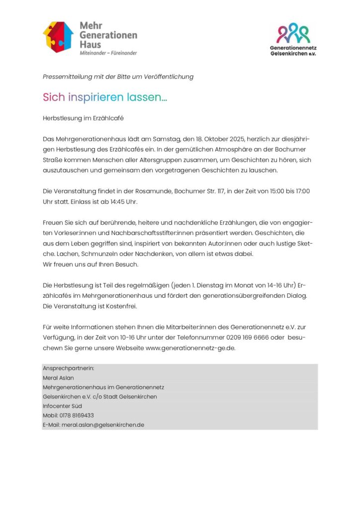 Am Samstag, den 18. Oktober 2025, lud das Generationennetz zu einer besonderen Lesung in die Rosamunde an der Bochumer Straße 117 ein. Unter dem Motto des arabischen Sprichworts „Ein guter Erzähler bewirkt, dass der Hörer mit den Ohren sieht“ präsentierten die Teilnehmenden des Erzählcafés gemeinsam mit den Nachbarschaftsstifter:innen ihre Geschichten, Erinnerungen und Gedanken.